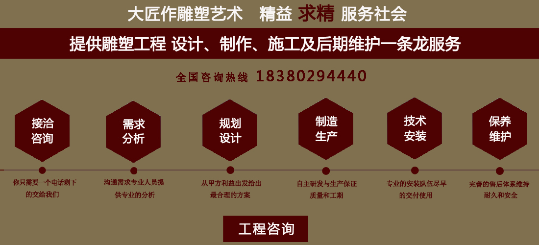 成都大匠作雕塑有限公司,是經(jīng)成都工商局審定注冊(cè)的正規(guī)專業(yè)雕塑制作及工程安裝服務(wù)機(jī)構(gòu),是由一群年輕富有朝氣的年輕人創(chuàng)辦,發(fā)軔于四川省成都市龍泉驛區(qū)。它是一家******于創(chuàng)作、制作和銷(xiāo)售為一體的公司。大匠作擁有多年從事公共藝術(shù)的專業(yè)人員和雕塑制作人組成的核心團(tuán)隊(duì),為您提供專業(yè)、具創(chuàng)新的設(shè)計(jì)及制作服務(wù)。公司成立以來(lái),秉承“******服務(wù)、誠(chéng)信為本”的宗旨,以客戶需求為目標(biāo)導(dǎo)向,不斷學(xué)習(xí),進(jìn)取,優(yōu)化和提高服務(wù)質(zhì)量,公司向您******——“您的滿意***是我們的信譽(yù)”,我們將以飽滿的熱情和******的服務(wù)贏得您的贊譽(yù)和支持。 愛(ài)心,細(xì)心,耐心,責(zé)任心是我們的要求,盡心盡職,為您打造出創(chuàng)新、專業(yè)、******的設(shè)計(jì)方案,我們堅(jiān)信先做人、后做事,用心對(duì)待客戶,實(shí)行透明收費(fèi),人性化服務(wù),本著對(duì)客戶負(fù)責(zé),對(duì)客戶負(fù)責(zé),更是對(duì)自己發(fā)展負(fù)責(zé)的態(tài)度,爭(zhēng)取做到讓每位客戶滿意